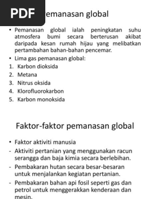 Apapun itu segala bentuk aktivitas manusia pasti akan memberikan dampak bagi lingkungan. Pemanasan global ini sangat erat kaitannya dengan pencemaran udara yang ada di seluuh dunia. Segala bentuk aktivitas manusia selalu berdampak bagi lingkungan, baik itu membawa dampak positif ataupun dampak negatif. Sudah tak tehitung lagi berapa banyak pabrik atau industri yang bermunculan. Faktor penyebab pemanasan global juga datang dari efek rumah kaca yang berlebihan. Sedasarwasa ini sering meniti dari bibir ke bibir umat manusia di segenap penjuru dunia ini tentang isu pemansan global. Demikian sedikit pembahasan mengenai pemanasan global: Pemanasan global menurut national wildlife federation adalah peningkatan suhu udara di bumu yang mengakibatkan terjadinya berbagai bencana alam seperti badai, banjir, kekeringan dan. Penyebab pemanasan global ini ada beberapa faktor. Selain daripada penipisan ozon, kejadian kemarau dan jerebu. Faktor terjadinya pemanasan global di bumi. Pemanasan global ialah keadaan alam sekitar yang mengalami peningkatan suhu yang tinggi berbanding dengan suhu normal. Pemanasan global terjadi karena gaya hidup manusia, pola konsumsi, dan teknologi yang ada di berbagai negara maju.