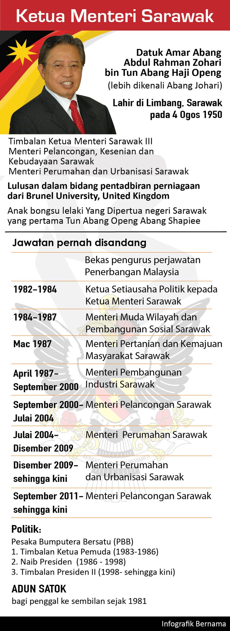 Related : Ketua Menteri Sarawak 2017 - Beliau adalah pemimpin sarawak yang pertama dilantik menjadi menteri dalam kerajaan malaysia,dengan memegang jawatan menteri yang menguruskan hal ehwal sarawak..
