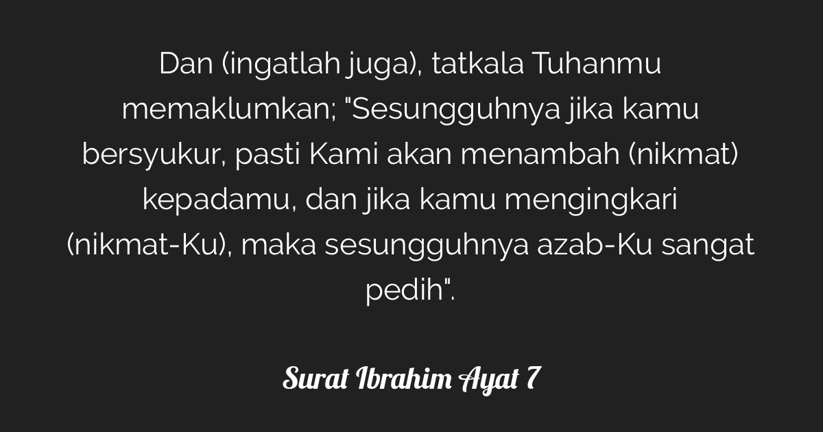 Tafsir Surat Ibrahim Ayat 7 Selalu Bersyukur Atas Nikmat Allah Swt Kumparan Com from blue.kumparan.com You eat, drink and sleep like us and have wife. Surah ibrahim is the 14th chapter of the holy quran and is classified as a meccan surah. You are a human being like us in every respect: وَإِذْ تَأَذَّنَ رَبُّكُمْ لَئِن شَكَرْتُمْ لَأَزِيدَنَّكُمْ ۖ وَلَئِن كَفَرْتُمْ إِنَّ عَذَابِى لَشَدِيدٌ. Listen surah ibrahim audio mp3 al quran on islamicfinder. Ibrahim is the 14th chapter (surah) of the qur'an with 52 verses (āyāt). You can also download any surah (chapter) of quran kareem from this website. Musa berkata kepada mereka, dan ingatlah ketika tuhan kalian memberitahukan dengan pemberitahuan yang tegas, 'jika kalian beryukur kepadanya.