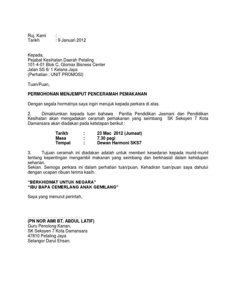 Sekolah kebangsaan bukit rahmat kampung bukit rahmat, 84700, gersik, tangkak, tel : Pihak kami amat berbesar hati sekiranya tuan dapat memenuhi jemputan kami. Contoh surat jemputan penceramah 1. Secara garis besar dikelompokan dalam. Surat rasmi jamuan akhir tahun gong shim b. Surat rasmi permohonan kesihatan, surat rasmi permohonan, surat rasmi permohonan kerja, surat rasmi permohonan cuti. Pengarah jabatan kesihatan negeripeti surat 8083287018 wp. Tuan, jemputan sebagai penceramah program rintis hidangan sihat sekolah (hits ). Permohonan contoh surat pengunduran diri. Ketua unit kesihatan sekolah jemputan sebagai penceramah program pendidikan kesihatan pendedahan awal remaja dengan segala hormatnya. ← surat jemputan dana warisan. Contoh karangan surat rasmi dewan sampah tidak dipungut via suratrasmip.blogspot.com. Kebiasaannya menjemput penceramah dari luar dari agensi atau sekolah itu sendiri.